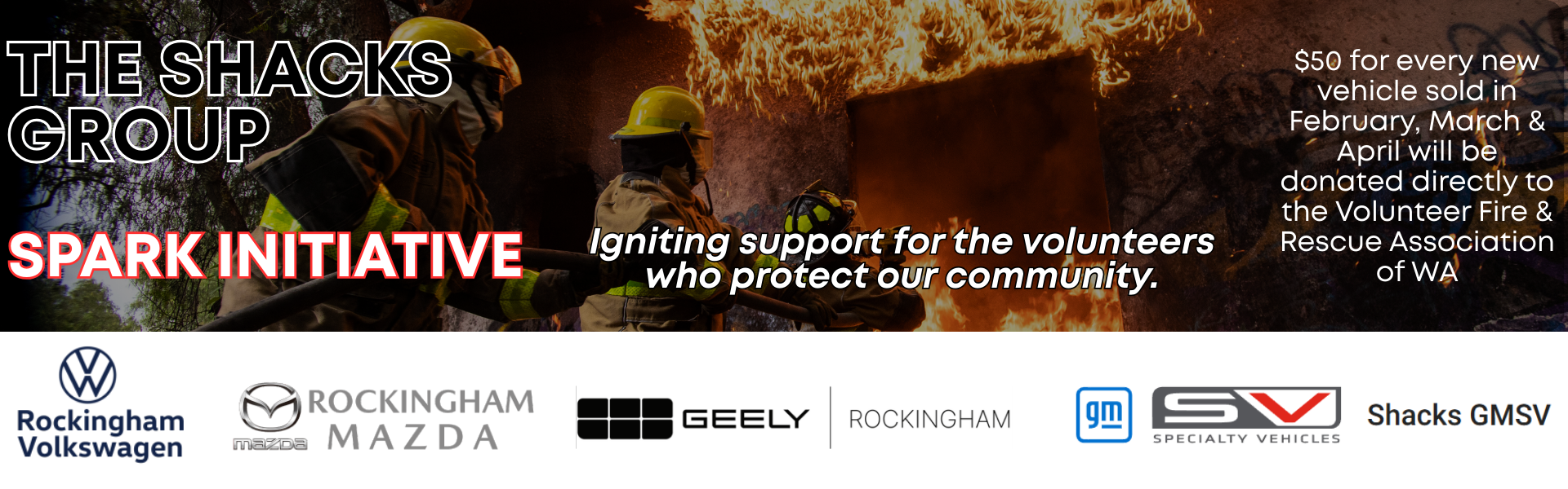 From February 1 to April 30, $50 from every new vehicle sold across all Shacks dealerships — Rockingham Mazda, Rockingham Volkswagen, Geely Rockingham and Shacks GMSV — will be donated directly to the Volunteer Fire & Rescue Services of WA.